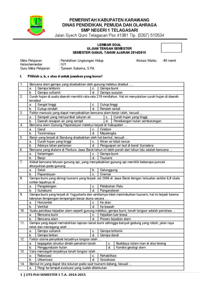 Sebagai pengajar di sekolah kami juga sering mengadakan belajar ulangan bersama ketika akan menghadapi ulangan / ujian di setiap semester 2. Download soal uas plh kelas 6 sd semester 2 dan kunci jawab. Soal uts plh kelas 6 semester 2 dan kunci jawaban revisi 2021. Contoh soal plh kelas 2 sd semester 1. Berilah tanda silang (x) pada huruf a, b atau c di depan jawaban yang paling benar ! Dokumen yang anda mencari sudah siap untuk unduhkan. Download/unduh buku materi pelajaran pendidikan lingkungan hidup (plh) untuk kelas 4 (empat) sd/mi semester 1 dan semester 2 silahkan klik pada tautan di bawah ini: Untuk itu disini kami akan memberikan perangat plh sebagai referensi pembelajaran yang sesuai kurikulum. Untuk mendownloadnya silahkan klik link download di bawah ini ! Soal ukk plh kelas 3. 0 komentar di materi pelajaran pendidikan lingkungan hidup / plh kelas 4 sd/mi semester i dan ii 0 response to buku pendidikan lingkungan hidup / plh kelas iv sd/mi semester 1 dan 2 Download soal ukk plh kelas 1 semester 2.